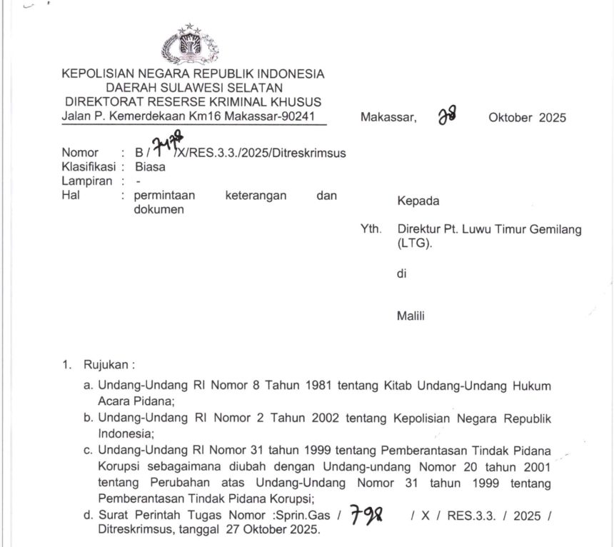 Hal itu diketahui setelah Ditreskrimsus Polda Sulsel melayankan surat pemanggilan dengan nomor : B/7478/X/RES.3.3./2025/Ditreskrimsus untuk dilakukan permintaan keterangan dan dokumen kepada Direktur PT LTG.