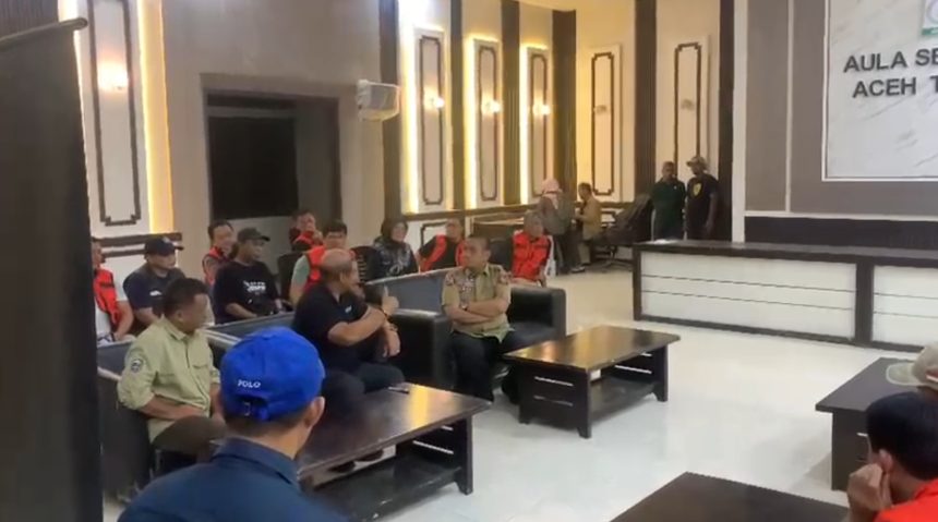 Bupati Luwu Timur, Irwan Bachri Syam bersama rombongan disambut langsung oleh Bupati Aceh Tamiang, Armia Fahmi diaula kantor Bupati Aceh Tamiang saat mengatarkan bantuan kemanusiaan. (dok)